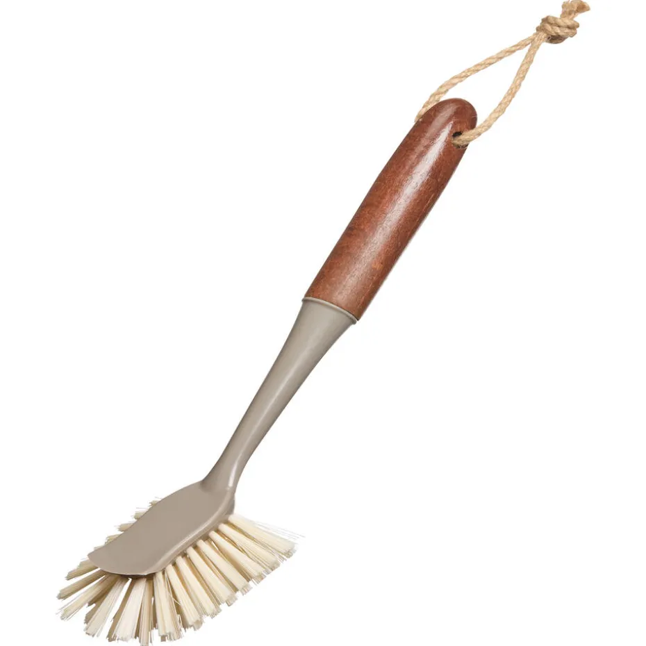 Deze afwasborstel in trendy taupe is perfect voor dagelijks schoonmaken in de keuken. Gemaakt van kunststof en hout biedt hij zowel stevigheid als een stijlvolle uitstraling. De borstel ligt comfortabel in de hand en is ideaal voor het grondig reinigen van borden pannen en bestek. Een must-have voor elke keuken!