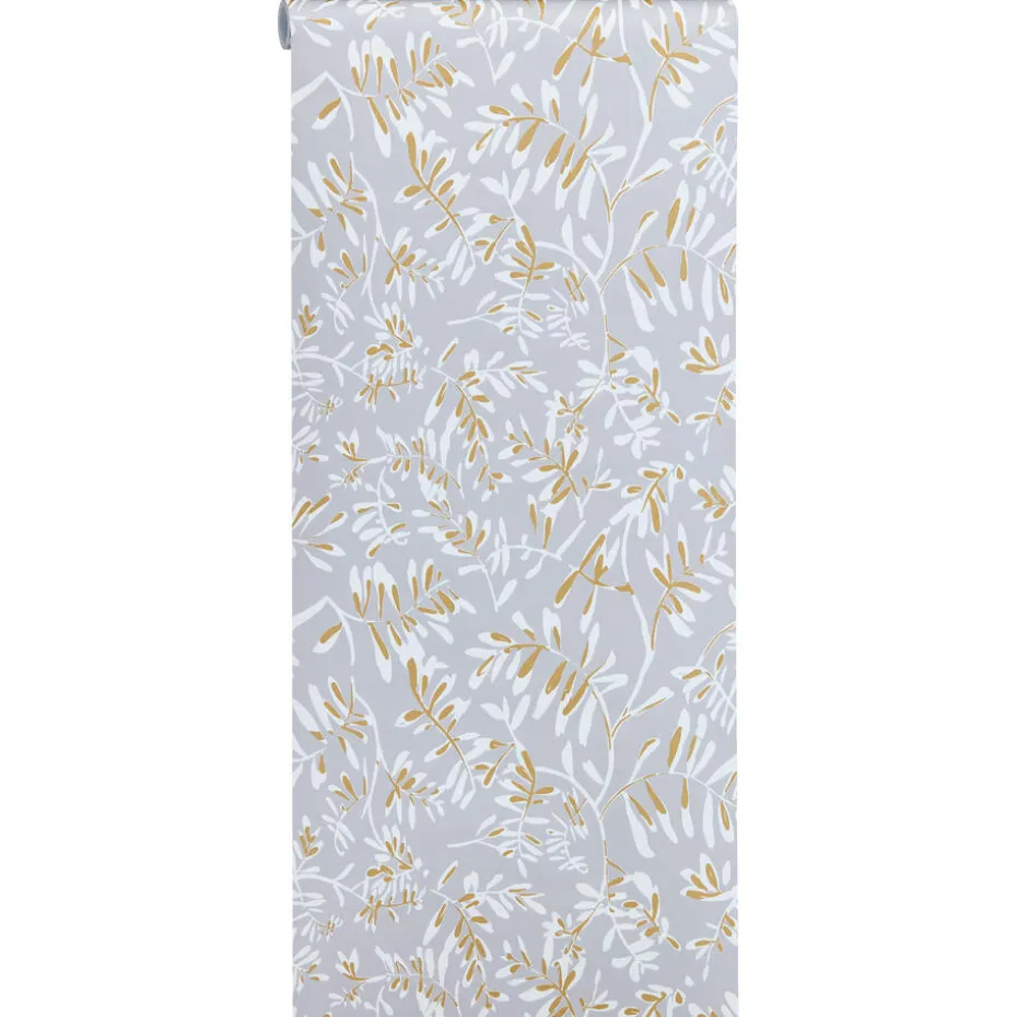 Vliesbehang Bloss in sfeervolle grijze en okergele kleur met een prachtig bladeren patroon. Het behang is voorzien van het FSC-keurmerk. Plakken met Perfax Pink. 10 meter per rol.
