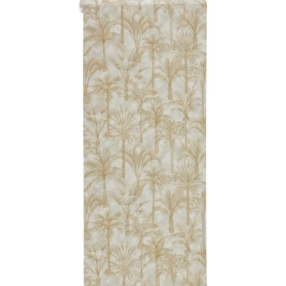 Vliesbehang okergeel met palmbomen print. 10 meter per rol. 53 cm breed.