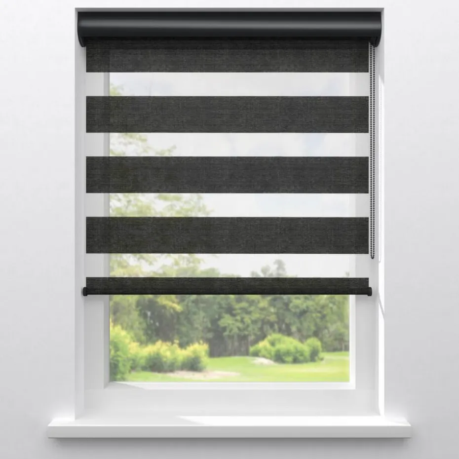 Lichtdoorlatend duo-rolgordijn zwart. De transparante banen hebben een fijne gaasstructuur. De afwisselende open en dichte stofbanen bewegen voor elkaar langs. Zo bepaal je eenvoudig de lichtinval en privacy. Je kunt zelf de kleur kiezen van de cassettes, eindkappen, kettingen, onderlatten en roedes. De bedieningszijde kies je ook zelf: rechts of links. Op maat te maken en eenvoudig met de juiste afmetingen te bestellen.