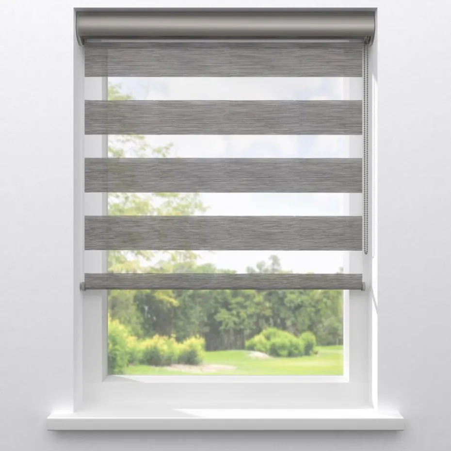 Lichtdoorlatend duo-rolgordijn grijs gemêleerd met streep dessin. De transparante banen hebben een grovere gaasstructuur. De afwisselende open en dichte stofbanen bewegen voor elkaar langs. Zo bepaal je eenvoudig de lichtinval en privacy. Je kunt zelf de kleur kiezen van de cassettes, eindkappen, kettingen, onderlatten en roedes. De bedieningszijde kies je ook zelf: rechts of links. Op maat te maken en eenvoudig met de juiste afmetingen te bestellen.