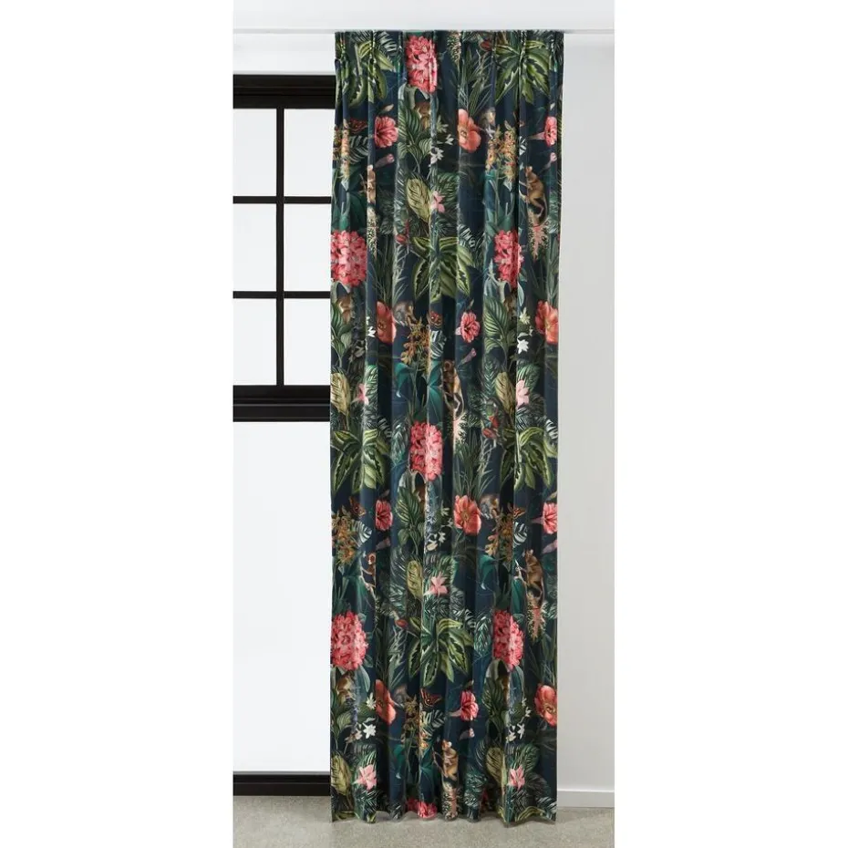 Lichtdoorlatende gordijnstof groen met bloemenprint. De glanzende velours stof is stevig, vormvast en soepel. 140 cm breed.