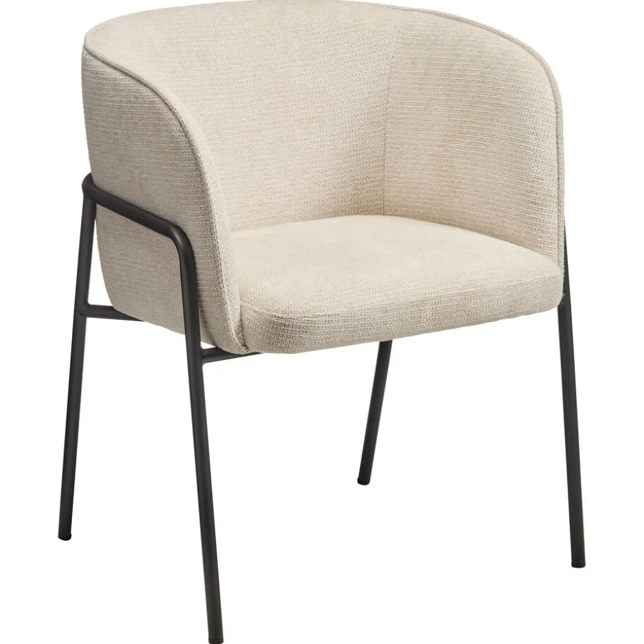 Luxe stoel gemaakt van een zandkleurige polyester stof. De stoel heeft hoge armleuningen en een heerlijk zitcomfort. De zwarte metalen poten gaan rondom wat een een chique uitstraling geeft. 58x58x76 cm (lxbxh). En een zithoogte van 47,5 cm.