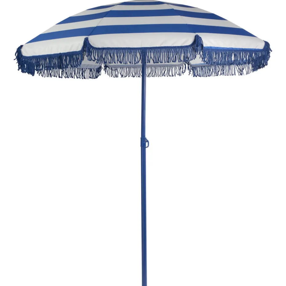 Strandparasol Modica is een stokparasol met een polyester doek. Het polyester doek heeft een wit met blauw streeppatroon en sfeervolle franjes langs de rand. De parasol heeft een diameter van 180 cm en is 190 cm hoog. Dus ben je op zoek naar een sfeervolle kleine parasol? Dan is de strandparasol Modica geschikt voor jou!