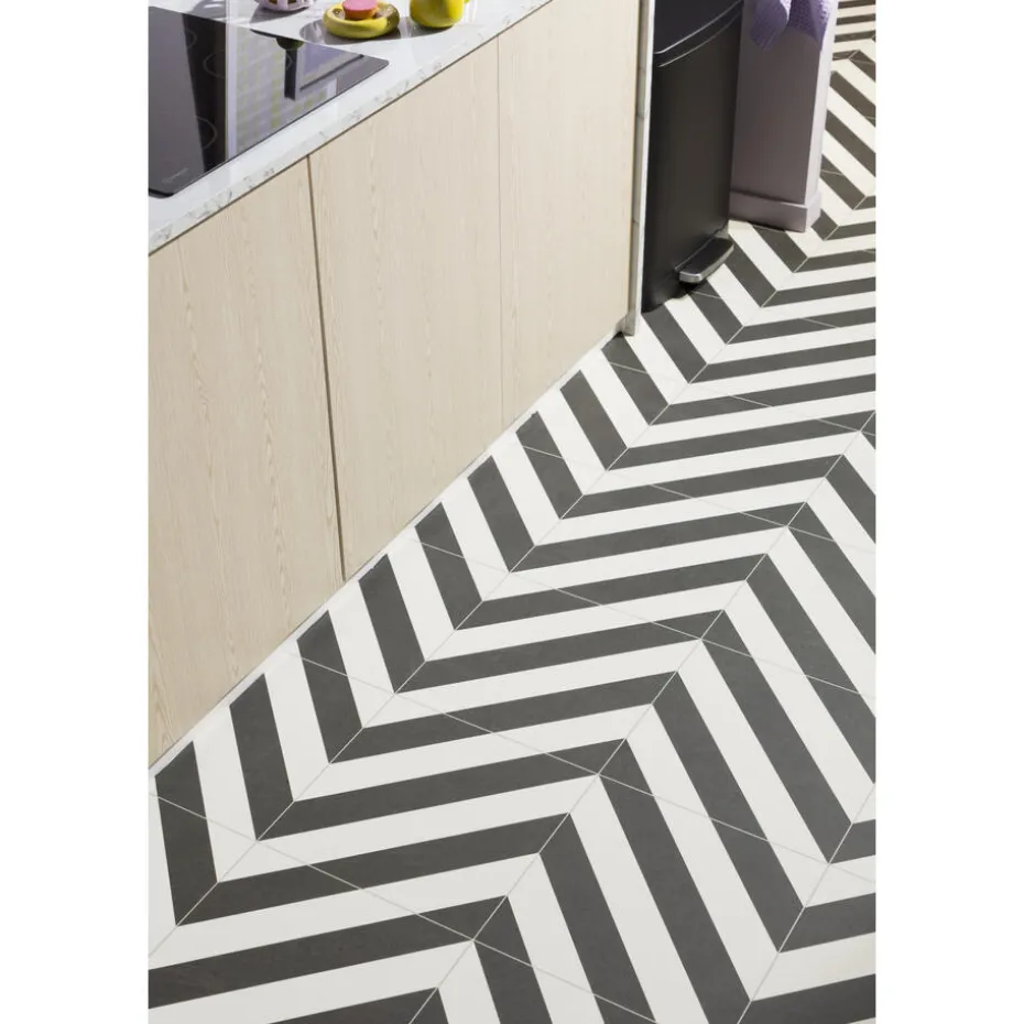 Vinyl Castro is een zwart wit vinyl vloer. Hij is perfect te combineren met diverse interieurstijlen, zoals modern, industrieel, retro en art deco. Vinyl vloer Castro en brengt veel karakter in je interieur. De vinyl vloer heeft een anti-slip laag, is isolerend en waterafstotend. Vinyl vloeren zijn ook perfect om te gebruiken in natte ruimtes en door de dunne laag geschikt voor vloerverwarming.