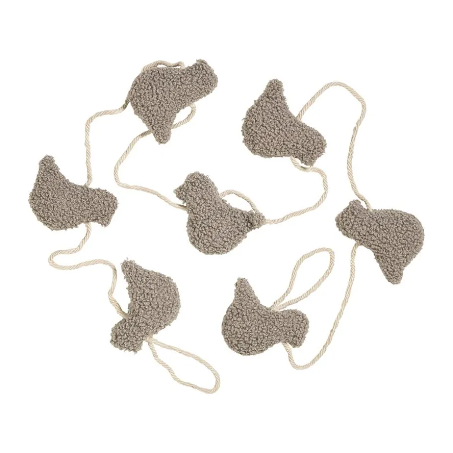 Een populaire vlaggenlijn voor de kinderkamer! Gemaakt van zachte teddy stof in de trendy kleur taupe, perfect voor een warme en stijlvolle uitstraling. Met schattige vogels als detail is deze vlaggenlijn dé blikvanger in elke baby- of kinderkamer. Een must-have decoratie die stijl en gezelligheid combineert!