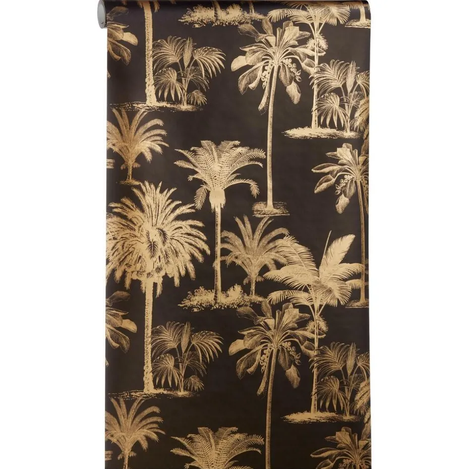 Zwart vliesbehang met tropisch dessin van palmbomen. Patroonhoogte: 53 cm. 10 meter per rol. Plakken met Perfax Roll-On.