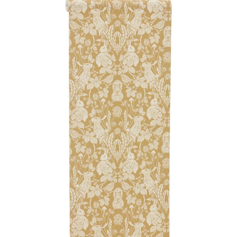 Behang Nina heeft een grafische print met bosdieren. Het behang is okergeel van kleur en gemaakt van cellulose. De patroonhoogte is 53 centimeter.