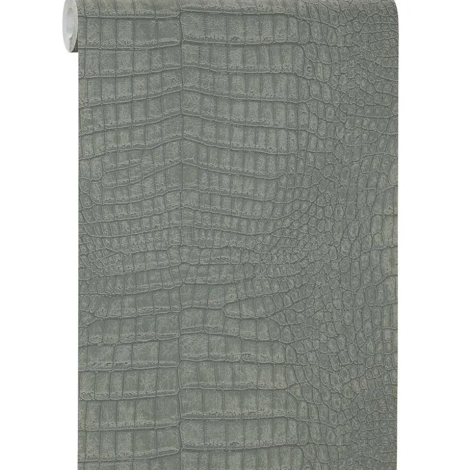 Vliesbehang met groen alligator dessin en voelbare structuur. Goed afwasbaar. Voorzien van het FSC-keurmerk. Plakken met Perfax Roll-On. 10 meter per rol.