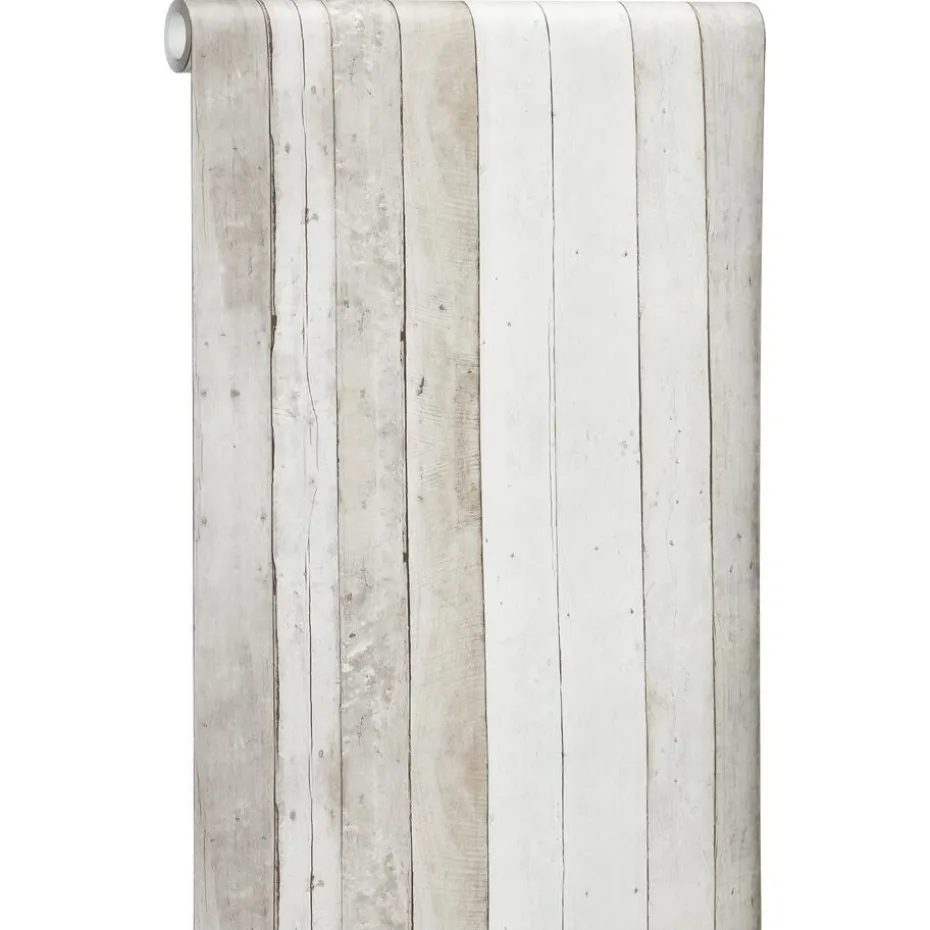 Stoer vliesbehang met steigerhoutprint. Kleur: grijs.