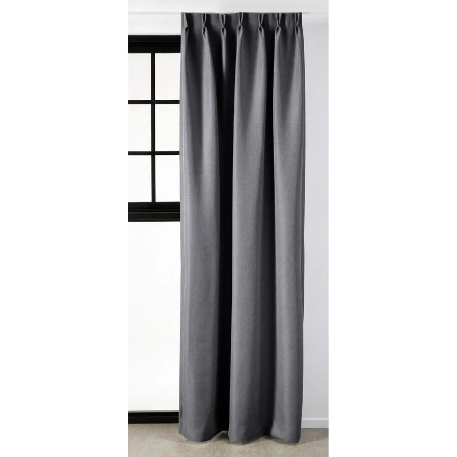Verduisterende geweven gordijnstof antracietkleurig met linnenlook. Stevig, vormvast, slijtvast en kleurvast. Deze soepelvallende, geweven dim-out gordijnstof is tot 80% verduisterend. De stof laat weinig daglicht door maar houdt niet het volledige zonlicht tegen. 148 cm breed.