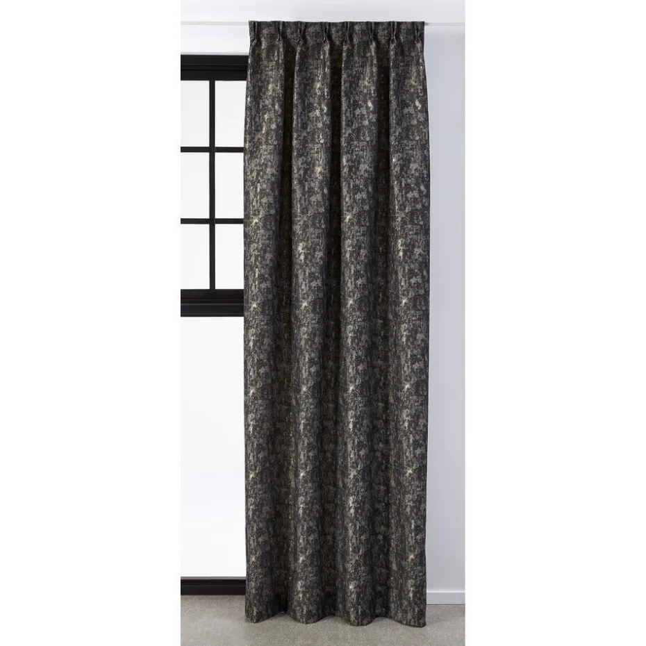 Lichtdoorlatende jaquard gordijnstof zwart met een verweerde metallic print. Stevig, vormvast en slijtvast. 145 cm breed.
