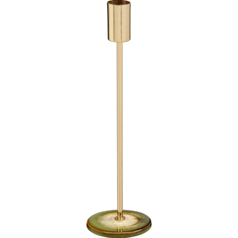 De Oppido kandelaar is een trendy toevoeging aan jouw interieur. Deze gouden sfeerlichthouder met groene voet is gemaakt van hoogwaardig aardewerk (stoneware) en straalt elegantie uit. Geschikt voor één dinerkaars zorgt de kandelaar voor een sfeervol en modern accent in elke ruimte. Perfect voor stijlvolle diners en gezellige avonden.