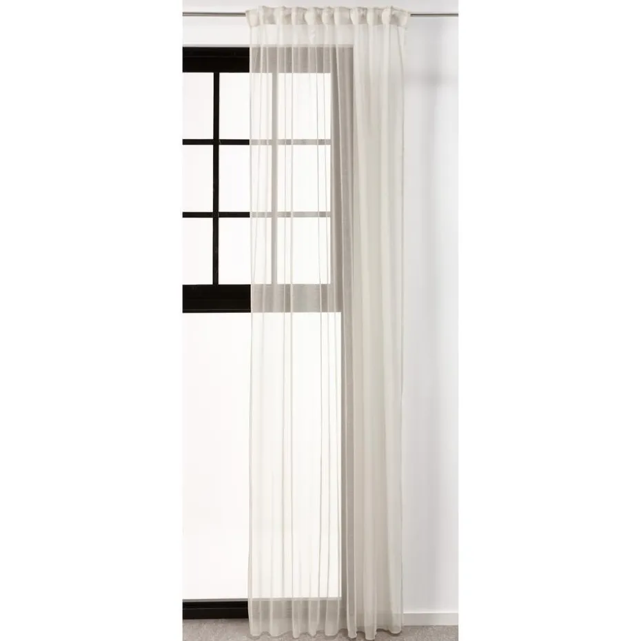 Kant en klaar ringgordijn van stevige zandkleurige stof. Soepelvallend en kreukherstellend. 140 cm breed.