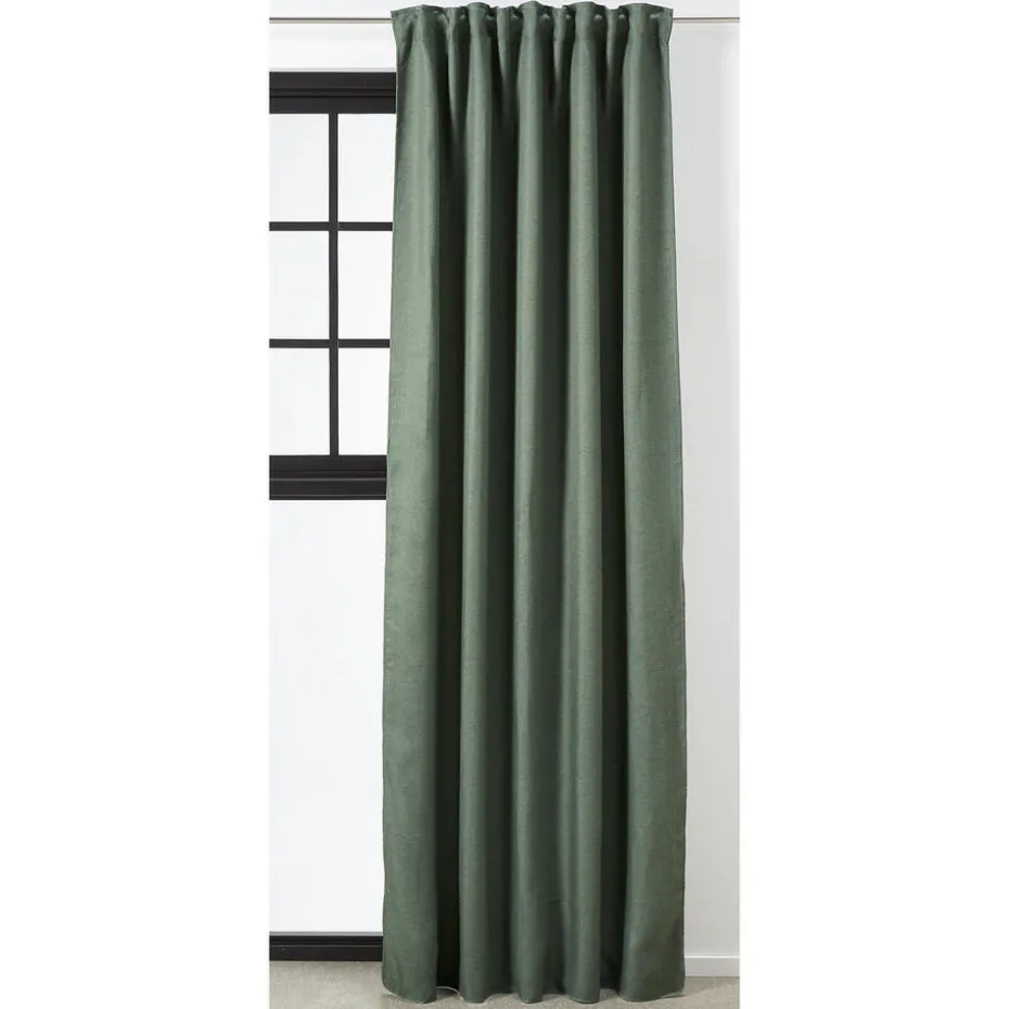 Kant en klaar gordijn van stevige groene stof. Soepelvallend en kreukherstellend. 140 cm breed.