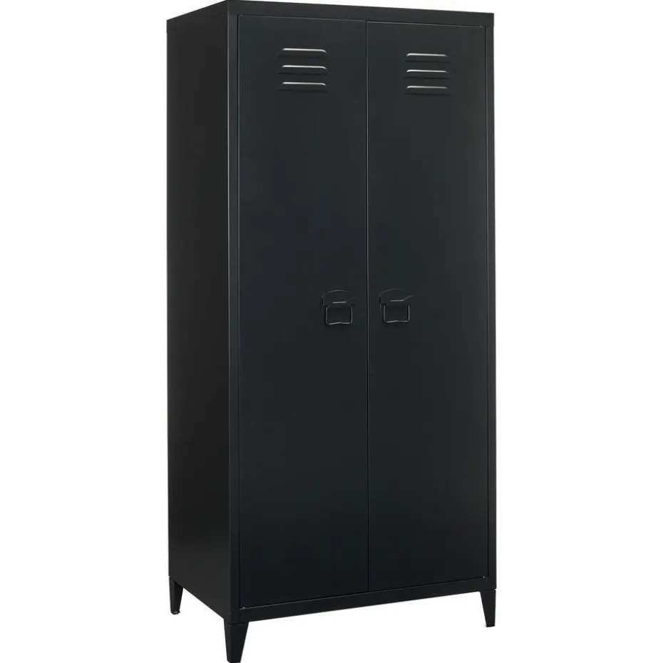 Stoere kledingkast van zwart metaal. Ziet er uit als een lockerkast. Met 2 deuren, een hanggedeelte en 1 legplank. 76x50x165 cm (lxbxh)
