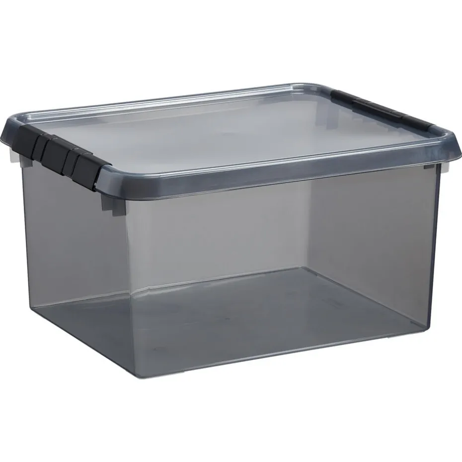 Doorzichtige grijze opbergbox met deksel. Van recyclebaar kunststof. 36 liter. 50x40x26 cm (lxbxh).
