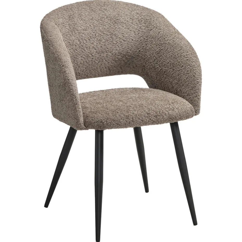 Comfortabele stoel gemaakt van een bruine bouclé stof. Met open rug, schuin aflopende armleuningen en zwarte poten. 57x59x81,5 cm (lxbxh).