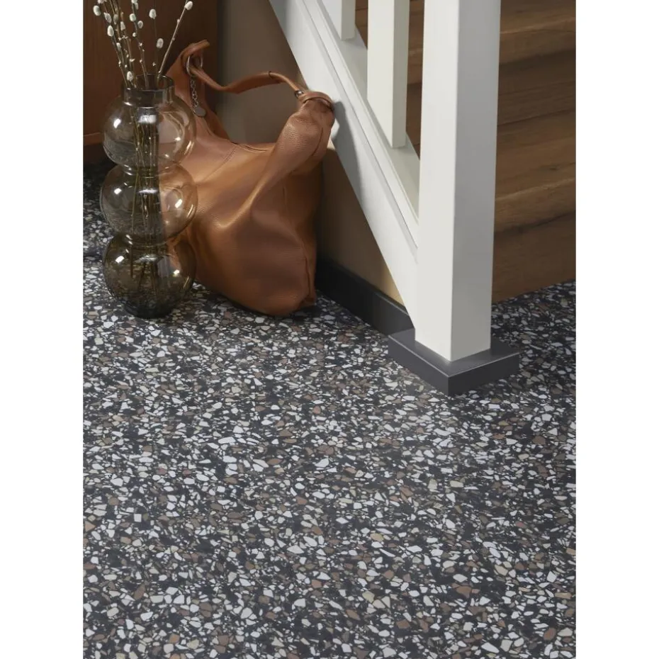 Het terrazzo patroon van de Stonemountain vloer brengt een eigentijds designelement in elke ruimte. Het patroon bestaat uit een mix van natuurlijke kleuren en texturen, waardoor je vloer een unieke en opvallende uitstraling krijgt.