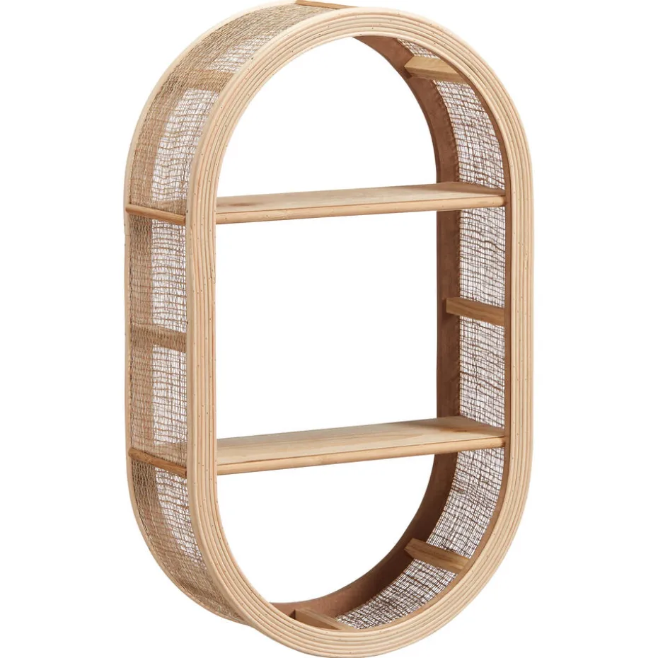 Met de ovale rotan wandkast voeg je sfeer toe, ideaal voor de kinderkamer of andere kamers. Met twee planken biedt deze naturel kast een handige plek voor kleine spulletjes, waardoor functionaliteit en stijl samenkomen.